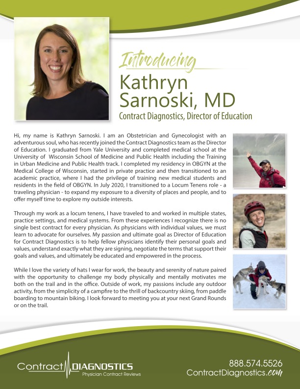 Dr. Kathryn Sarnoski: Thanks everybody for joining us on a Wednesday night. We appreciate you being here. We hope you find this really useful. Thank you, John and Madison for the intro. Just so you guys, hear again, we are with Contract Diagnostics. I am a practicing OBGYN who also helps out as the Director of Physician Education with Contract Diagnostics. We specialize in physician contract review. That is all we do, all day, every day, and my role is to help educate you on the language and terms behind the contract, give you some ideas for negotiating the contract, and tonight talk about them more in the context of a locum setting as well, and to be a good resource for you. I’m one of your colleagues; I go through this every day as I’m looking for jobs, too, from private practice to academics, to locums, employed and in between. I’ve done it all. So, I am here to be a resource for you as well. So hopefully we’ll answer a lot of questions as we go through this. Of course, it’s comprehensive, but we’re never going to touch on everything so we do leave time for a Q&A at the end. It’ll be about 35 minutes of content, and then that should give us a solid 20 min for the Q&A so feel free to put those in the Q&A chat box and we will get to those at the end, and we’ll answer anything afterwards if we can’t get through them all tonight.